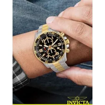 Show moreThe Invicta Men's 14876 Specialty Chronograph is not just a timepiece; it's a manifestation of style and functionality. With its luxurious combination of steel and gold-tone stainless steel, this watch flaunts a diameter of 45mm and a thickness of 13mm, making it both bold and comfortable on your wrist. The striking black dial is complemented by luminous hands and hour markers, ensuring you can read the time with ease, even in low-light conditions. Powered by the precise Japanese quartz movement (VD57 Caliber), this watch promises reliability and accuracy, making it an ideal companion for both casual outings and formal occasions.