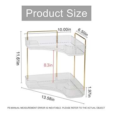 Show moreThe INVSSENE Corner Bathroom Countertop Organizer is your ideal solution for transforming cluttered countertops into beautifully organized spaces. Designed with elegance in mind, this vanity tray not only facilitates efficient storage but also enhances the aesthetics of your room. Made from premium ABS plastic and adorned with a stylish gold steel bracket, this two-tiered organizer seamlessly fits into the corner of your countertop, effectively utilizing otherwise wasted space. At just a few minutes to assemble, the tool-free installation makes it accessible for everyone – no handyman skills are required!