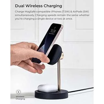 Show moreThe iOttie Velox Magnetic Wireless Duo Stand is a game-changing charging solution designed exclusively for MagSafe compatible devices, encompassing the latest iPhone 12, 13, 14, and 15 series models. This revolutionary dual charging station not only provides up to 7.5W of fast charging for your iPhone but also a reliable 5W power output for your AirPods or other Qi-enabled accessories. With its sleek midnight blue design and elegant champagne gold accents, it seamlessly blends into any home or office decor, ensuring that your tech setup looks as good as it functions.