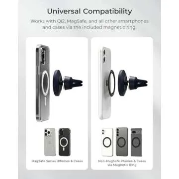 Show moreIntroducing the iOttie Velox MagSafe Compatible Air Vent Car Phone Holder, a perfect blend of functionality and design tailored for today’s tech-savvy drivers. This universal magnetic car phone mount effortlessly accommodates all smartphones, including the latest iPhone 12 through 16 series and various Android devices. With its innovative magnetic ring adapter, your non-MagSafe devices can enjoy the same secure hold, demonstrating unparalleled compatibility that sets this mount apart. The mount’s sleek and compact profile not only enhances the aesthetic appeal of your car’s interior but also guarantees a clutter-free environment. Each feature has been meticulously designed to offer you convenience and ease of use while on the road.