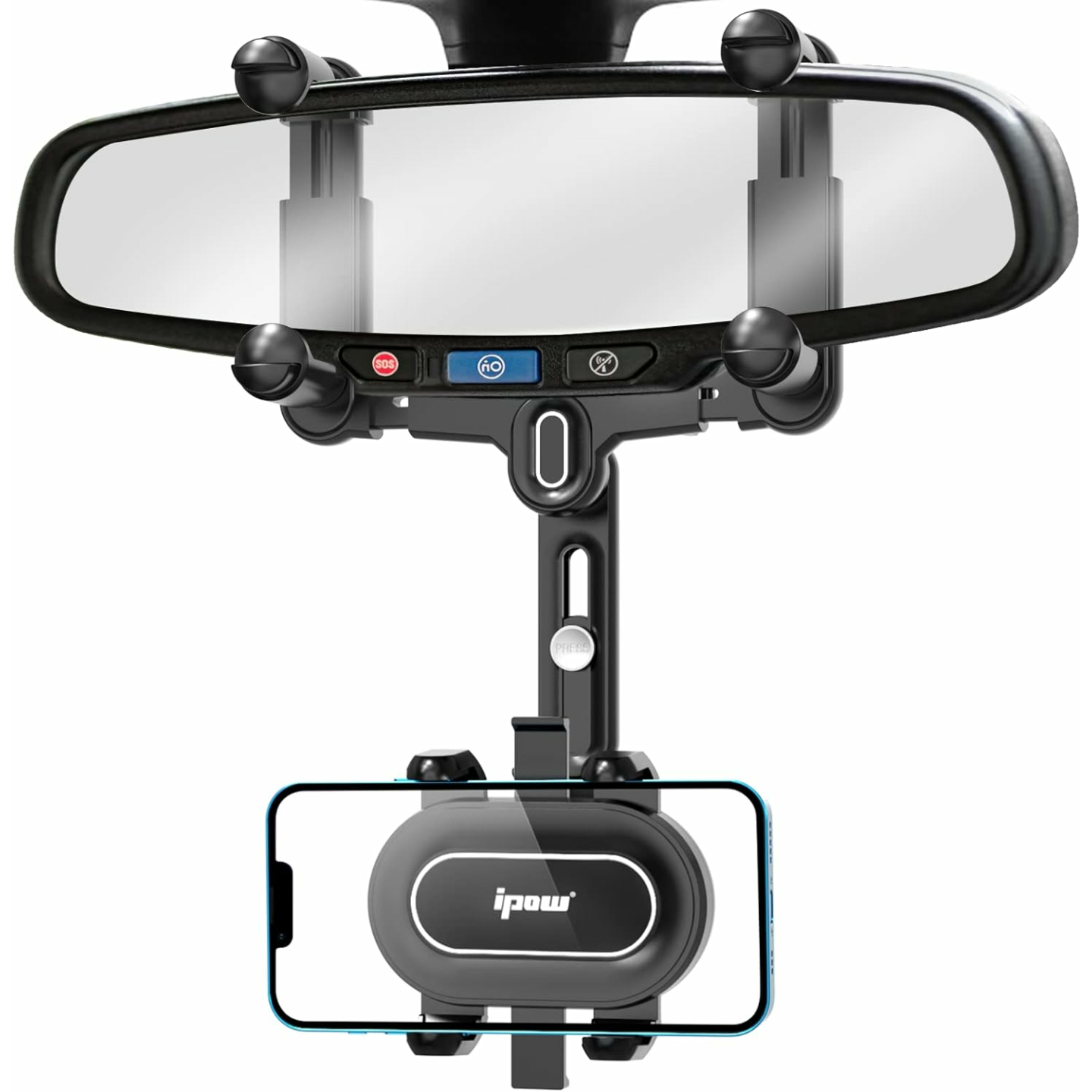 The IPOW phone holder stands out due to its 360° rotation and retractability, four-corner fixed anti-shake design, and universal compatibility with all phones and car rearview mirrors. These features ensure that your phone stays in place, is easily adjustable, and does not obstruct your view while driving.