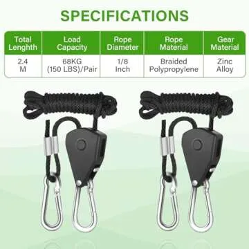 Show moreIntroducing the iPower GLROPE 1-Pair 1/8 Inch 8-Feet Long Heavy Duty Adjustable Rope Clip Hanger, designed to meet all your heavy-duty hanging and tying needs with ease and efficiency. Constructed from braided polypropylene for exceptional durability, this reliable system boasts an impressive load capacity of up to 150 pounds per pair, reinforced with zinc plated steel materials ensuring robust performance in tough conditions. The set includes two 8-foot long ropes, making it versatile for various applications from grow light hangers to tie down ropes, leveling up your home or work projects.