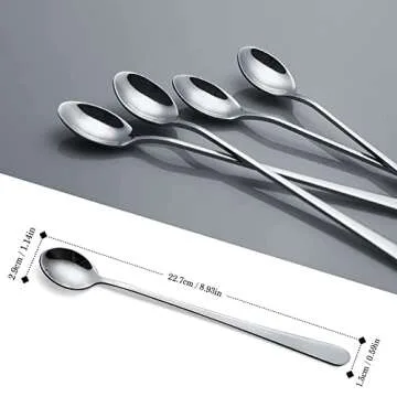 Show more If you're on the hunt for the perfect gift that combines both practicality and elegance, look no further than our exquisite set of 4 iced tea spoons. Crafted from durable high-quality stainless steel, these spoons promise longevity and style. With a length of 8.93 inches, they are designed to reach the bottom of even the tallest glasses and pitchers, making them ideal for ice cream sodas, milkshakes, and tall coffee mugs. The 1.14-inch wide square spoon head is expertly crafted for easy stirring and scooping, ensuring that every concoction gets mixed perfectly.