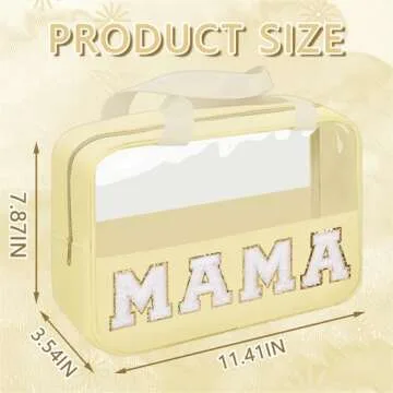 Iqimott Chenille Letter Patch Mama Bag, Preppy Clear Makeup Cosmetic Bag Large Toiletry Storage Tote Bag with Handle, Transparent Nylon Waterproof Organizer Zipper Pouch for Travel Women Girls(Beige)