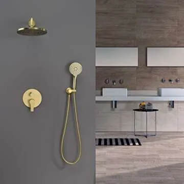 Iriber Shower System Wall Mounted Shower Faucet Mixer Set with Luxury High Pressure Shower head and 3-Setting Handheld, Bathroom Shower Trim Kit Contain Pressure Balance Valve,Brushed Gold