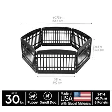 Show moreIntroducing the IRIS USA 24" Dog Playpen—a versatile, high-quality solution to meet all your pet containment needs. This modern playpen is expertly crafted in the USA using premium global materials, ensuring both durability and style. Designed for small dogs and puppies, it doubles as an exercise yard, play gate, and small dog fence, providing your furry friend with a safe and engaging environment. With an innovative multi-panel design, you can easily customize the shape and size to fit any space, making it perfect for homes, gardens, or while on the go.
