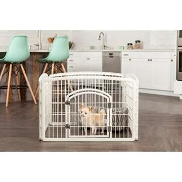 Show more The IRIS 24'' Exercise 4-Panel Dog Playpen with Door is a versatile and convenient solution for pet owners seeking a safe space for their furry friends. Whether you need a sturdy play yard, a reliable play gate, or a small dog fence, this innovative product adapts to your needs with ease. Crafted from high-quality commercial-grade plastic, the pen is designed for longevity and durability, ensuring that your pets stay safe without compromising on their playful spirits.