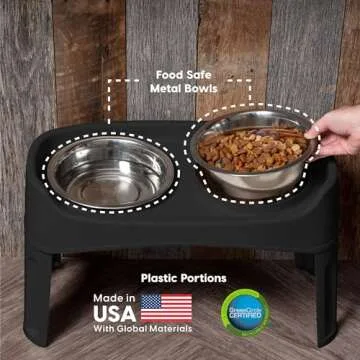 IRIS USA Elevated Dog Bowls, Adjustable Height, 2 Thick 64 oz Stainless Steel Bowls, Spill-Proof with Raised Outer Rim, Durable Made in USA Plastic, Easy Assemble, 2 Heights 4.63" or 12.25" Black