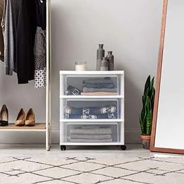 IRIS USA Plastic Drawer Storage Organizer Rolling Cart, with Wheels Casters, 3-Drawers, for Classroom Art Craft Supplies Dresser Closet Bathroom Dorm Bedroom Laundry Room, Wide, White/Clear