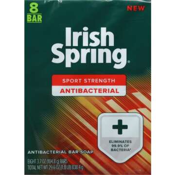 Show moreDiscover the invigorating cleansing power of Irish Spring Antibacterial Bar Soap, a compact yet highly effective soap designed to wash away bacteria and invigorate your senses. Each 3.7-ounce bar, available in a pack of 8, offers unwavering antibacterial protection, eliminating 99.9% of harmful bacteria, including S. aureus and E. coli. With its crisp, refreshing scent and rich lather, this soap not only cleanses your body but also delivers 12-hour deodorant protection, ensuring you feel fresh and revitalized from dawn till dusk. Best of all, it's paraben, phthalate, and gluten-free, making it a conscientious choice for your daily hygiene needs.