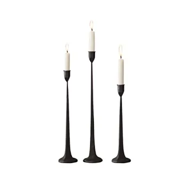Show moreTransform any space into a warm and inviting atmosphere with our elegant iron taper candle holder set. Crafted from heavy cast iron with a rustic black painted finish, these candle stands exude an antique charm that enhances any decor. The set includes three candle holders of varying heights (S:3.0×14.0 inch, M:3.0 ×17.0 inch, L:3.0 ×19.0 inch), creating a visually stunning undulating candlelight effect. Perfect for 3/4inch candles and LED taper candles, these holders are versatile for any occasion.