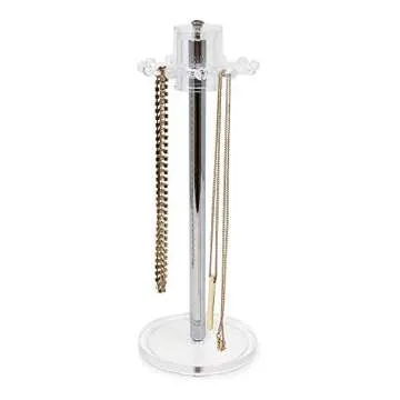 Show more Introducing the stunning Isaac Jacobs Clear Acrylic Necklace Holder, an exquisite blend of style and functionality designed to elevate your jewelry organization experience. This elegant piece not only serves as a jewelry organizer, but it also enhances the décor of any space with its sleek clear acrylic design. Perfectly sized at 11” by 3.5”, it fits comfortably on your vanity, dresser, or bathroom countertop, making it an essential accessory for anyone who cherishes their jewelry collection.
