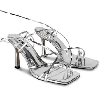 ISNOM Silver Strappy Heels for Women Lace up Heels Silver Heels for Women Tie up Heels Square Toe Heels Stripper Heels Women's Heeled Sandals Gladiator Heels for Women Wrap up Heels Stiletto Heels