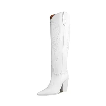 ISNOM White Knee-High Cowboy Boots: Stylish & Comfortable