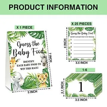 Show moreTransform your next baby shower into an enchanting adventure with the **ISOVF Game Set**, featuring a delightful Woodland Safari theme. This set includes everything you need to create a fun and engaging tabletop game for your guests to enjoy. The standout component is the beautifully designed self-standing sign, measuring 5"x 7", which sets the stage for the excitement ahead. Accompanied by **25 answer cards** (4"x 3.5") and **6 number cards** (2.1"x 3.5"), this set facilitates smooth gameplay wherever you set it up. Crafted from heavy gram coated paper, both the cards and sign are not only stunning but also sturdy and reusable, making them perfect for memorable occasions.