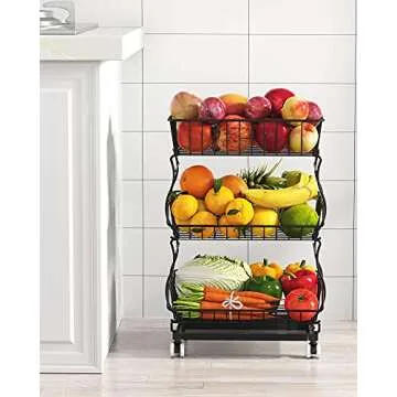 With a generous dimension of 16.2"L x 11.4"W x 24.7"H and 9" spacing between each tier, this basket provides a large capacity to neatly store a variety of items including fruits, vegetables, snacks, canned food, toys, books, and more. Its durable metal construction with a rust-resistant black coating ensures outstanding durability while maintaining a sleek appearance. Plus, the mesh grid design not only allows for optimal airflow but also helps prevent spoilage, keeping your produce fresh for longer.