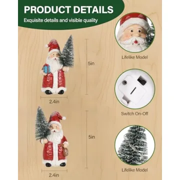 Show moreWelcome the festive spirit into your home with the iStatue 2-Pack Lighted Santa Resin Figurines with Christmas Trees. This charming set features two delightful Santas, elegantly holding intricately designed bottle-brush trees, creating an inviting vignette that enhances any space—from shelf arrangements to mantel displays. Perfect for offices, tiered trays, or as a centerpiece on an entry table, these mini decorations effortlessly spread holiday cheer. Each piece is beautifully crafted to stand at approximately 5 inches tall and 2.4 inches wide, making them compact enough to fit into any tight space yet significant enough to draw admiration.