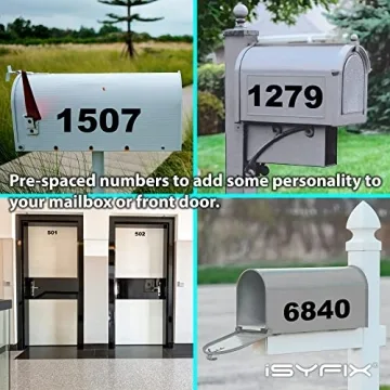 Show more Transform your mailbox with the iSYFIX Black Vinyl Numbers Stickers—the ultimate choice for showcasing your address in style. These elegant, self-adhesive numbers not only stand out aesthetically but also serve a practical purpose. With premium quality at its core, the iSYFIX vinyl stickers come in a 4-inch tall format that ensures visibility from a distance. Easy to apply and designed for both indoor and outdoor use, these decals are the perfect solution for identifying your home or business with clarity and sophistication. Their die-cut design guarantees neat edges, enhancing your overall presentation.