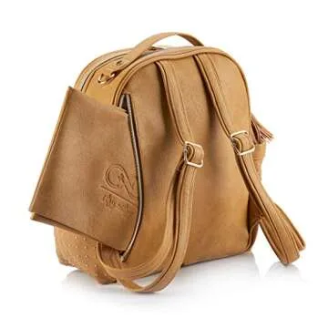 Itzy Ritzy Chelsea + Cole Mini Diaper Bag Backpack - Studded Mini Backpack with Changing Pad, 8 Pockets, Rubber Feet & Tassel - Caramel with Sweetheart Print Interior and Gold Hardware
