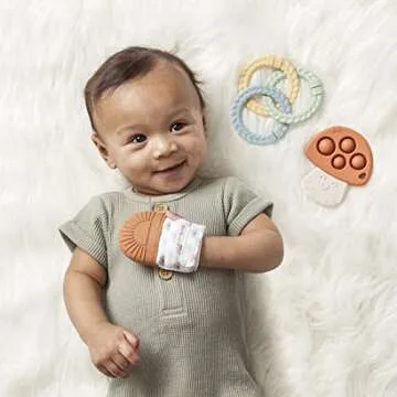 Show more Introducing the Itzy Ritzy Teething Toy Gift Set – the ultimate playtime companion for your little one! This delightful collection features a unique mushroom sensory popper toy, a soothing sunrise teething mitt, and three vibrant textured linking rings, all designed to captivate your baby and provide sensory-exploration opportunities. Crafted with attention to detail and safety, each piece in this set encourages baby's developmental milestones while offering a delightful sensory experience. Perfect for soothing sore gums and stimulating little hands, this gift set is the ideal choice for parents seeking to inspire early play and learning.