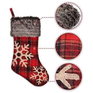 Show moreIntroducing the Ivenf Christmas Stockings — a delightful addition to your holiday decor that will bring warmth and style to your festive celebrations. Each stocking, measuring an impressive 18 inches, features a rustic burlap design adorned with a large plaid snowflake and a plush faux fur cuff. The combination of quality jute and soft materials creates a charming yet durable festive accessory. Perfect for hanging over the fireplace or adorning your Christmas tree, these stockings are designed not just to look good but to last for years. The hearty construction ensures they can hold plenty of stuffing, making them ideal for accommodating all your special gifts.