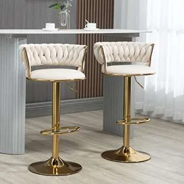 Ivory White Velvet Bar Stools Set of 2- 360° Swivel Adjustable Bar Chairs Kitchen Stool Counter Height Island Chairs Sillas Para Barra De Cocina High Barstools with Back Gold Footrest for Home Bar
