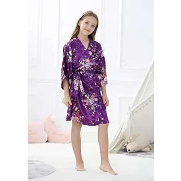 IVRRISS Kid Girls Silky Kimono Robes Party Set with Floral Patterns for Spa Brithday Wedding Short Robes (Purple, Tag 6)