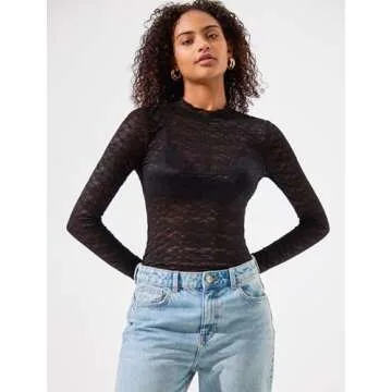 IWD Womens Mesh Long Sleeve Tops Sheer Lace Blouses Sexy See Through Mock Neck Tee Shirts Black