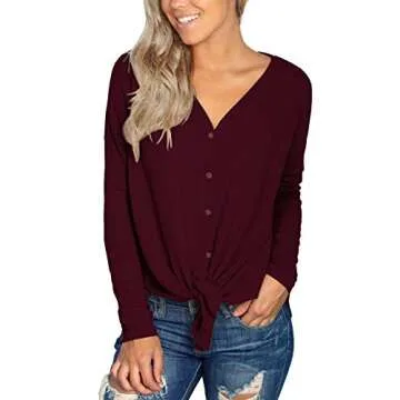 IWOLLENCE Womens Loose Henley Blouse Bat Wing Long Sleeve Button Down T Shirts Tie Front Knot Tops Wine Red, M