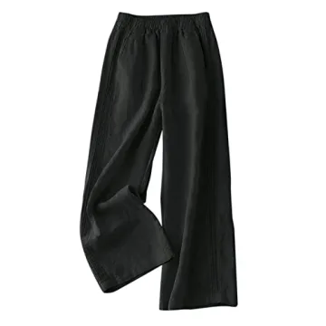 IXIMO Women's 100% Linen Pants Elastic Pleated Wide Leg Straight Fit Palazzo Pants Long Style Black M