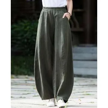 IXIMO Women's Casual Cotton Linen Baggy Pants with Elastic Waist Relax Fit Lantern Trousers Army Green M