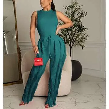 IyMoo Two Piece Outfits for Women Fall Winter - Lounge Sets 2 Workout Sleeveless Tank Tops Bodycon Long Pants Set Sweatsuits Drawstring Waist Fringe Tassel Tracksuits Green, S