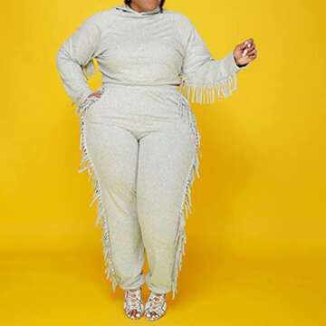 Show more Introducing the IyMoo Women’s Plus Size 2 Piece Tracksuit Set – a perfect blend of comfort, style, and functionality, designed specifically for women who embrace their curves. This chic gray ensemble features a long-sleeve hoodie topped with stylish tassels, paired with relaxed-fit sweatpants that ensure you stay cozy whether you’re lounging at home, heading to the gym, or running everyday errands. The lightweight yet durable fabric allows for freedom of movement, making this tracksuit ideal for your workout sessions or casual outings. Enjoy the versatility of a set that looks as good as it feels!