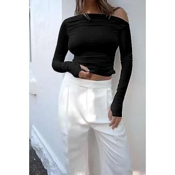 J.Corrine Women's Cropped Off Shoulder Tops Long Sleeve Asymmetrical Unique Ruched Y2K Tees Soft Shirts Black XL