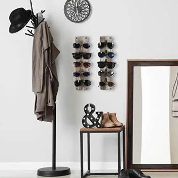 Show more The Stylish Sunglass Organizer is a decorative and attractive solution for all types of eyewear enthusiasts. This charming wall-mounted wooden organizer allows you to hang and display your favorite daily sunglasses, adding an element of style to any room. Its rustic farmhouse design complements various decor styles, turning clutter into a visually appealing feature.