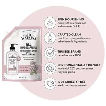 Show moreIntroducing the J.R. Watkins Gel Hand Soap Refill in a delightful Rosewater fragrance—an essential addition to your home that keeps hand hygiene at its best without compromising on skin health. This refill pack includes three pouches, each boasting a hefty 34 fl oz of luxurious, all-natural hand wash designed to refill your favorite soap dispenser up to three times! Made in the USA, this alcohol-free, cruelty-free hand soap ensures a gentle but thorough cleansing experience while soothing your hands with every wash.