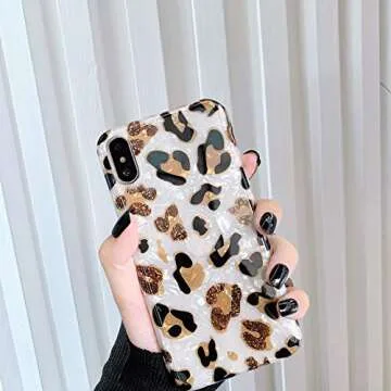 Show more Introducing the ultimate companion for your iPhone Xs Max: a stunning phone case that blends style with protection. This sleek case is designed exclusively for the iPhone Xs Max 6.5 inch, ensuring a perfect fit without compromising functionality. Its glossy back cover features a dazzling gold glitter pearly shell complemented by a chic white leopard pattern, making it a must-have accessory for fashion-forward individuals.