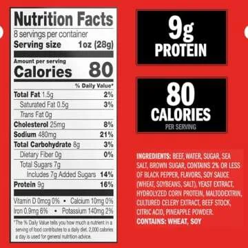 Show more Introducing the delightful Jack Link's Beef Jerky, a perfect blend of flavor and nutrition that makes snacking an enjoyable experience! Each serving of this premium jerky boasts 9g of protein and only 80 calories, making it an exceptional choice for anyone looking to maintain a healthy lifestyle while still indulging in something tasty. With Jack Link's, you get a snack that is not just delicious, but also a rich source of protein essential for your diet.