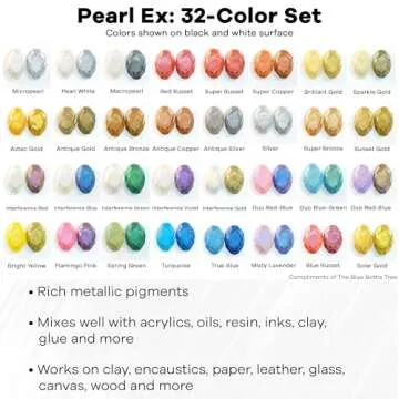 Show more Introducing a world of creativity with the Jacquard Pearl Ex Metallic Mica Powder, an artist's essential for those who want to elevate their craft projects. This versatile powder can be mixed seamlessly with a binder or sealed after application, making it suitable for a vast selection of materials such as wood, fabric, clay, paper, and glass. Whether you're looking to create your own metallic paint, calligraphy ink, or add a personal touch to resin projects, this mica powder offers endless possibilities to bring your artistic visions to life.