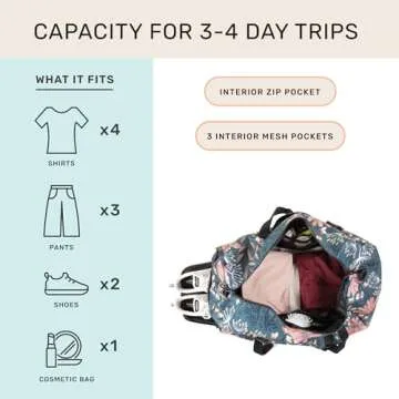 The bag is spacious enough to fit essentials for a weekend trip, including clothes, toiletries, and shoes.