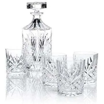 Show more Complement your bar with this ornate 5-piece whiskey decanter set that redefines sophistication and elegance. Crafted by James Scott, this remarkable set includes a timeless, squared 24 oz decanter accompanied by four luxurious 11 oz whiskey glasses—all exuding classic charm and refinement. The intricate design and the lead-free crystal material employed in this set not only enhance its visual appeal but also ensure safety and durability for storing your favorite spirits. This whiskey decanter set offers an opportunity to serve and toast with class, whether you're enjoying a quiet evening at home or hosting formal gatherings.