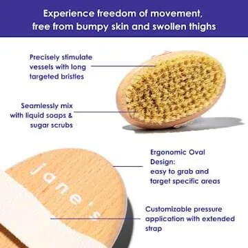 Show moreAre you ready to elevate your skincare routine to new heights? Introducing Jane’s Dry Brushing Body Brush — the ultimate tool for lymphatic drainage and rejuvenating your skin. This specially designed shower scrubber not only exfoliates but also enhances your body’s natural detox process. Crafted with soft yet firm bristles, it effectively clears away dead skin and improves circulation, providing a spa-like experience right in your shower or bath. Whether you're looking to enhance the appearance of your skin, reduce the look of cellulite, or simply indulge in a revitalizing scrub, this brush is an essential addition to your bathing rituals.