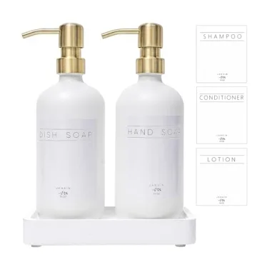 Show moreTransform your kitchen or bathroom into a stylish haven with the exquisite Janxin Glass Soap Dispenser Set. Crafted from thickened BPA-free white glass, each dispenser holds 16 Oz and features a stunning gold stainless steel pump that adds a touch of sophistication to your decor. This set includes a beautifully hand-made wood tray, providing a sturdy base while enhancing the overall aesthetic. Not only does it look good, but it also comes with a collapsible silicone funnel for mess-free refilling and five attractive waterproof labels (Hand Soap, Dish Soap, Lotion, Shampoo, and Conditioner) to keep your space organized and stylish.