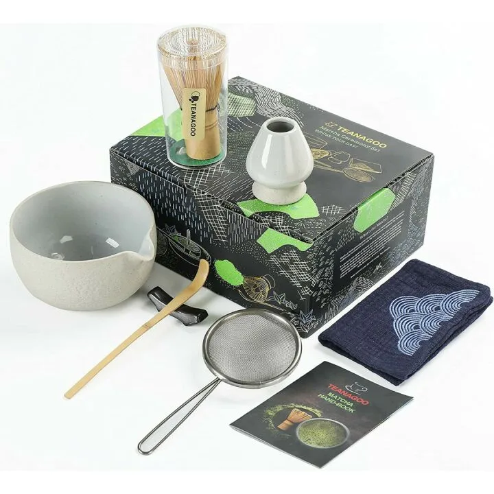 The set includes 7 pieces: a bamboo whisk, bamboo scoop (chashaku), a ceramic bowl (chawan) 510 ml/18 oz, a ceramic whisk holder, a ceramic scoop stand, a cotton tea cloth (chakin), and a matcha powder sifter.