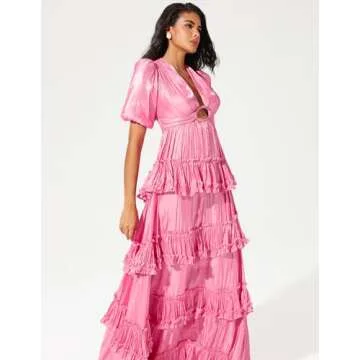 Jardinvue Pink Layered Ruffle Hem Dress Glossy Maxi Tiered Dress Stunning Formal Dress Wedding Guest Dress for Women Chic Womens Birthday Party Gown
