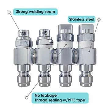 Show more Introducing the Jariko Jrod Pressure Washer Nozzle Set – the ultimate accessory for your pressure washing needs! Engineered for performance, this 4-way pressure washer nozzle is crafted from durable stainless steel. With a robust design that features welded seams, it delivers unmatched strength and corrosion resistance, ensuring it stands up to the rigors of demanding cleaning tasks. Compatible with 5 to 6 GPM pressure washers, the Jariko nozzle effortlessly fits standard 1/4" quick-connect fittings, making it a versatile solution for both professional and home cleaning applications. Whether you're tackling soft washing, high-pressured cleaning, or reaching those tricky areas, this nozzle set has you covered.