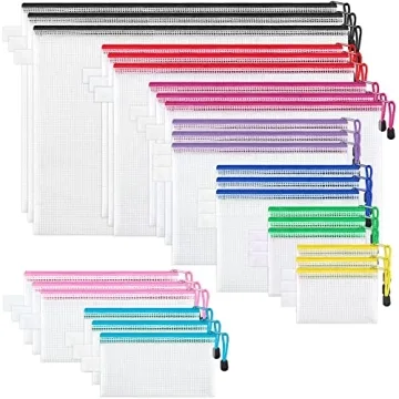 Show more Introducing the JARLINK 27 Pack Mesh Zipper Pouches—the ultimate solution to organization. With a stunning array of 9 sizes and 9 vibrant colors, these multipurpose waterproof pouches cater to all your storage needs, whether at school, home, or the office. Perfect for sorting everything from essential school supplies to travel accessories, each pouch is designed to keep your belongings safe and easily accessible. Thanks to their waterproof and translucent material, you can keep items free from spills while still having a glimpse of their contents without needing to unzip.