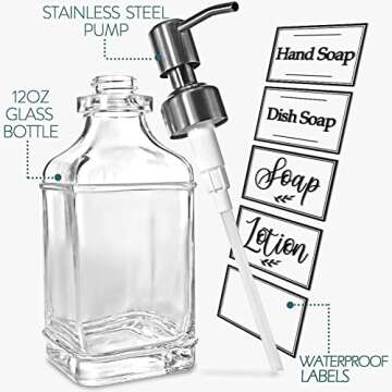 Show more Introducing the stunning Antique-ish Glass Soap Dispenser, a perfect blend of elegance and functionality for your home. Designed with a streamlined soft square bottle and rounded corners, this dispenser stands at 7.8 inches tall and holds up to 12 ounces of your favorite liquid soap, lotion, or essential oil. Crafted from durable glass and finished with a rust-proof pump made from premium 304 stainless steel, this dispenser ensures long-lasting brightness without the worry of corrosion or rust.