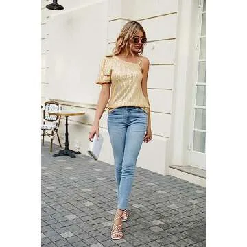 JASAMBAC Sparkle Sequin Strappy Tank Top Short Sleeve One Shoulder Camisole for Cocktail Party Gold XL