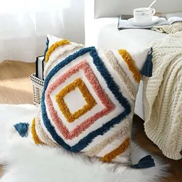 Show moreTransform your home decor with the stunning JASEN Boho Throw Pillow Covers. Designed to elevate any living space, this exquisite pillow cover features a mesmerizing diamond tufted pattern with intricate handmade woven details, perfect for adding a touch of sophistication and style. Crafted from a blend of 45% cotton, 45% polyester, and 10% viscose, with a 100% cotton backside, it measures a generous 18x18 inches—ideal for cushions on couches, beds, or even in your car.